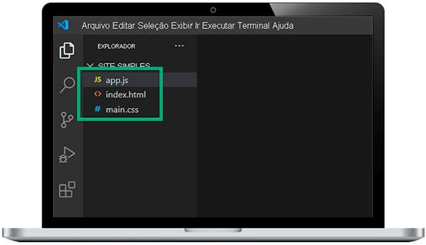 Aqui você criará uma estrutura de projeto simples que inclui três arquivos: um HTML, um CSS e um JavaScript.